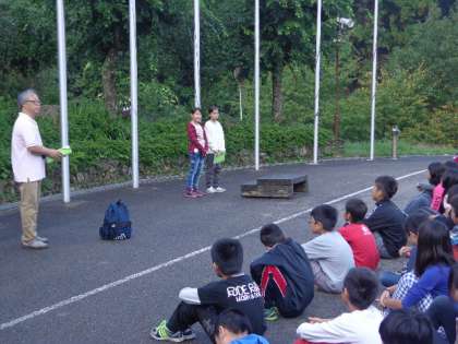 3日目の朝、山に霧がかかっていました。刻々と霧の様子は変わり、徐々に晴れていきました。今日の朝の集いは、常磐野小学校だけで行いました。青空が広がるさわやかな朝です。