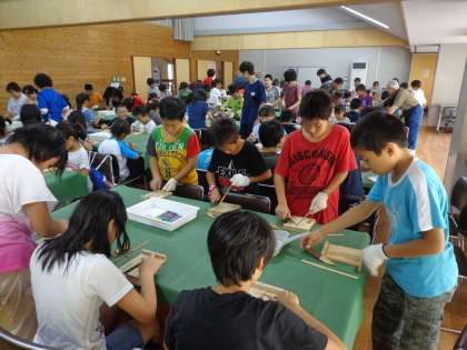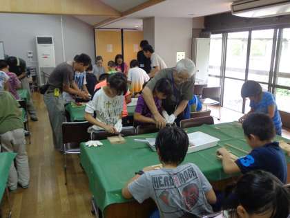 山の家で使う竹ばしを自分で作りました。小刀を使って竹を削り丸くしていき,先の方はさらに細くしていきます。オリジナルの竹ばしの完成です。記念の物として,家でも使えそうです。