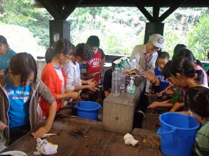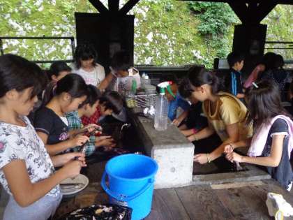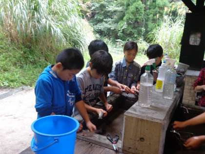 とったイワナを今度は,調理します。まずは,はらわた(内臓)を出して串にさす作業です。嫌がる子もたくさんいるかと思いましたが,説明を聞いてどの子も上手にはらわたをとっていました。