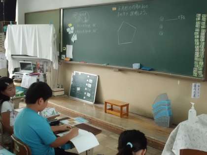 今日は、五角形について、内角の和の求め方を考えていました。