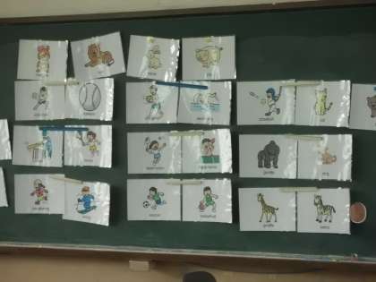 先生の流暢な英語に合わせて、いろいろな単語を発音したり、単語カードを使って、遊びを通して英語に慣れ親しんだりしていました。