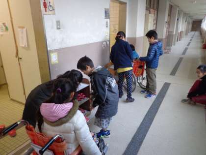 障がいのある人の思いや願いを知ることをめあてに,車いす体験をしました。トイレでスリッパが乱雑にあると車いすに乗っている人は困ることなどにも実際に気づいていました。
