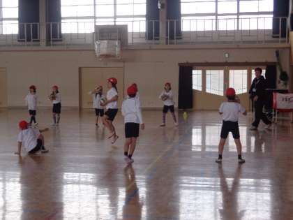 1組の3時間目は体育でした。体育館で,ボールを投げる・受ける活動をしていました。