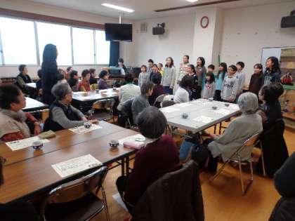 3月1日(日)常磐野社会福祉協議会主催の「ひな祭り昼食会」がありました。前には,立派なおひなさま・お内裏様の掛け軸が飾られていました。本校の合唱部の児童が,「うれしいひなまつり」と「ふるさと」を合唱しました。来ておられた地域のお年寄りの皆さんにとても喜んでいただきました。