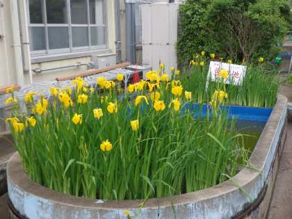中庭の魚の池には,キショウブがとてもきれいに咲いています。