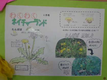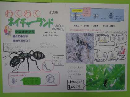 今年度より植物や生き物により興味を持ってもらおうと,協力指導の教員が毎月『わくわくネイチャーランド』という掲示物を作ります。各学級に配布するとともに,南校舎1階西出入口入ってすぐの研究用掲示板にもはっています。