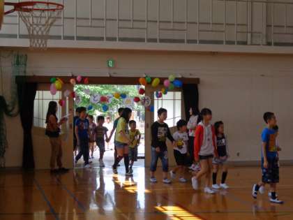5月13日(水)1年生を迎える会を1時間目に行いました。1年生は,6年生に手をつないでもらって嬉しそうに体育館に入場しました。