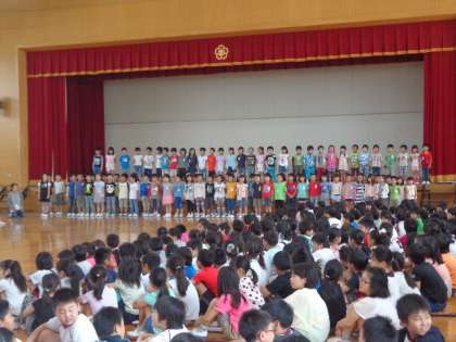 上級生の学年の歌やリコーダーのプレゼントの後,1年生は,覚えた常磐野小学校の校歌を全員で元気よく歌いました。