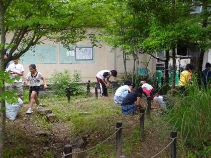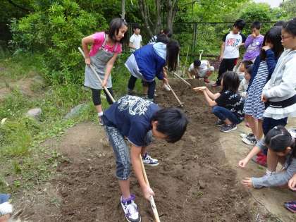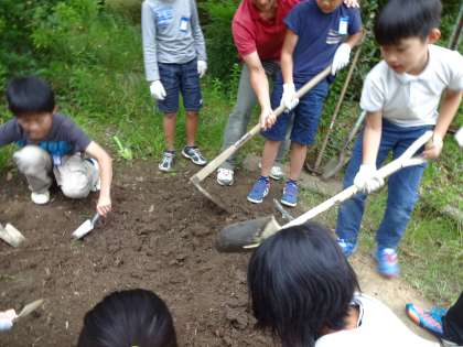 まずは「田おこし」です。スコップやクワを使って何度も何度も土を掘り混ぜ,やわらかくしていきました。当初は田おこしだけをする予定でしたが,子どもたちから「ネイチャーランドをきれいにしたい」という声があがり,周囲の草ぬき・落ち葉拾いもあわせておこないました。