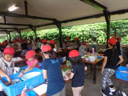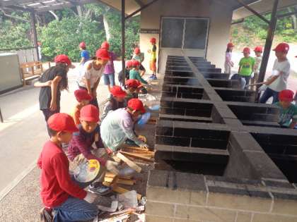 午後3時からは、野外炊事に挑戦しました。グループですきやき風煮を作りました。野菜を切ったりかまどにまきをくんで火を燃やしたり、それぞれの役割を決めて協力して作りました。とてもおいしくでき上がりました。