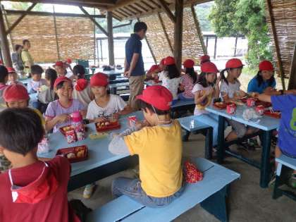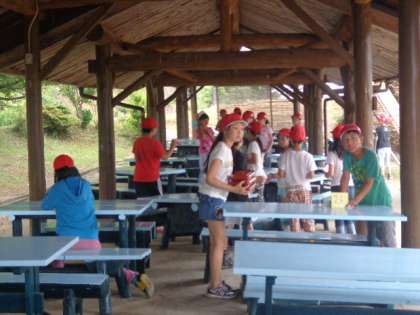 朝食をあずま屋で食べました。食事係の人が準備や挨拶の号令を頑張ってくれました。