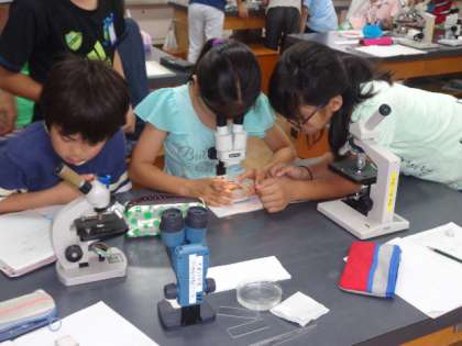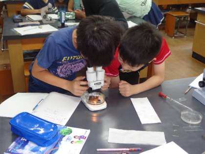 ネイチャーランドの池の水を双眼実体顕微鏡や顕微鏡を使って調べました。子どもたちはいろいろな小さな生き物がいることにとても驚いていました。それがメダカのえさになっているのではないかと考え,次の時間本当にメダカはその小さな生き物を食べるのかを調べることになりました。