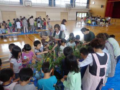 地域の社会福祉協議会・女性会,他地域の方にお越しいただきました。子どもたちは地域の方と一緒に,七夕の飾りや願い事を書いた短冊を笹につけました。