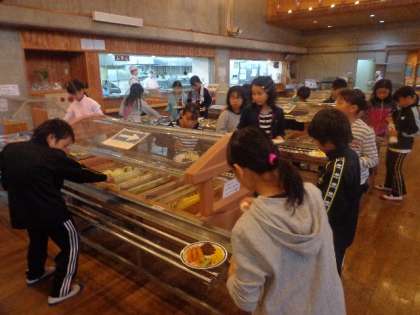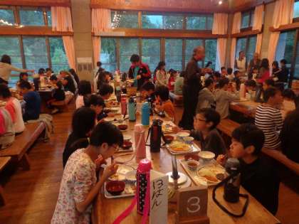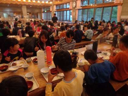 入浴の後は夕食です。山の家の食堂はバイキング形式です。子どもたちはバランスよくたくさん食べていました。