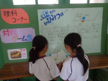 10月の理科コーナーは,磁石を使った対戦ゲーム盤です。ゲーム盤の上にいる人形をゲーム盤の下から割り箸の先についた磁石を動かして遊びます。子どもたちが来て,楽しみながら対戦していました。