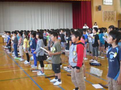 学芸会練習が始まっています。音楽室で練習してきた歌を今日は体育館で歌ってみました。思った以上に音が飛ばず,もう一度息を吸うことや口をしっかりとあけることを確認しました。リコ—ダーの曲も自信を持ってみんなできるようにしていきたいですね。
