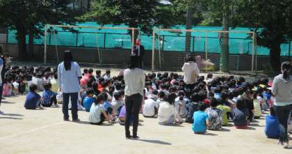 運動場に避難した後は,校長先生の話を真剣に聞いていました。火災の原因の第3位は子どもの火遊び・たき火だそうです。これから暑くなって,花火などをする機会も増えると思いますが,必ず大人の人と一緒に楽しんでほしいと思います。火事は,建物などが燃えてしまうだけでなく,命を落とすこともある恐ろしいものです。十分に気をつけていきましよう。