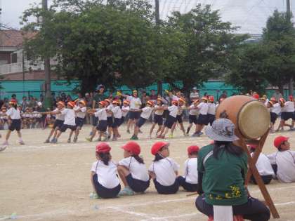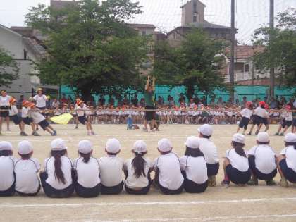 3・4年の綱引き。「がんばって引きまっしょい!」。気合を入れて互いに引き合いました。大接戦で全色1勝1敗の引き分けでした。