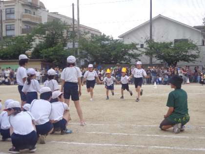 1年と6年のきょうだい競技は,王冠リレーです。1年生に被らせる王冠をバトン代わりに1年生を気遣いながら6年生は走っていました。