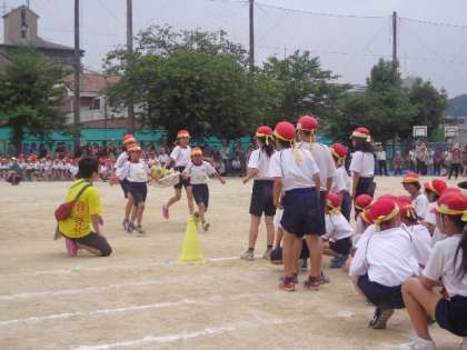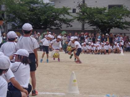 2年と5年のきょうだい競技は,「おかごでわっしょい」でした。かごに入れたボールを落とさないようにリレーしていきました。