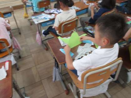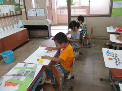 そしてそれを画用紙にはりました。みんなそれぞれいろんなものを生み出していました。