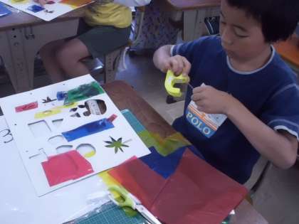 カッターナイフの使い方を学習しました。そして,安全に気を付け,様々な形を切り抜きました。色セロハンをはって,光を通してみると,とてもきれいでした。