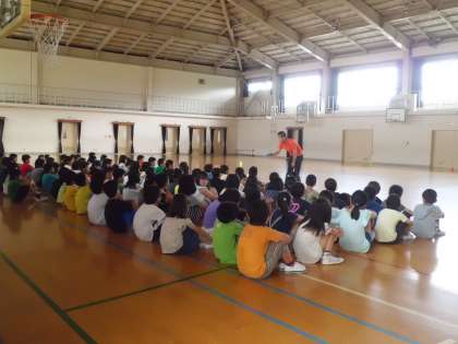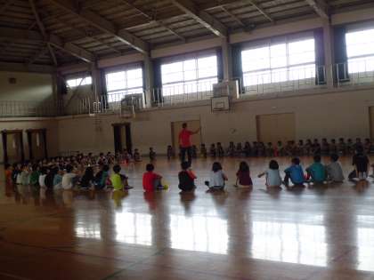 5校時は体育館に集まって,キャンプファイヤーの話を少し聞きました。子ども達は「早く行きたい〜!」という様子。