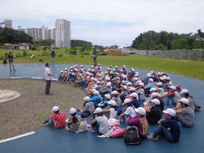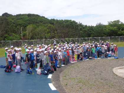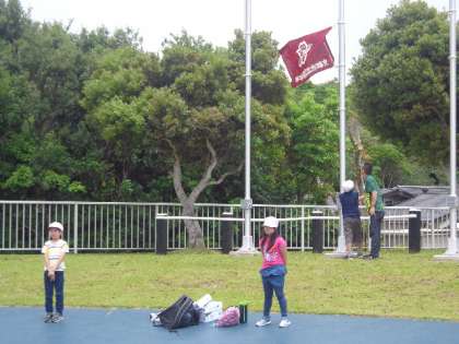 みさきの家に到着しました。入所式を第一営火場でしました。校旗をあげながら校歌を元気よく歌いました。