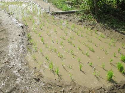 総合の学習で,米作りをしていきます。今日はいよいよ1人2株ずつ苗を田んぼに植えました。代かきをした田んぼに素足で入ると,「気持ちいい!」という子もいれば「ちょっと苦手」という子もおり,1人1人土の感触を味わうことができました。苗をグッと押し込むとしっかりと植わって,3クラスが植え終わると田んぼらしく仕上がりました。