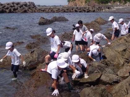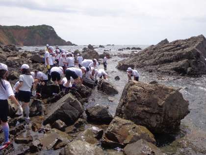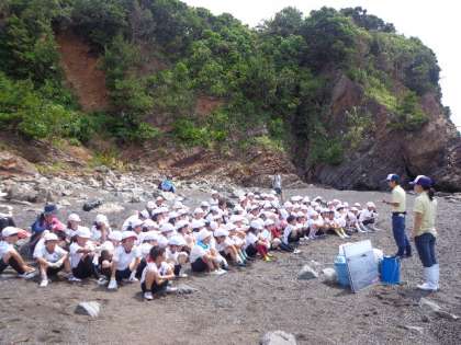 宮崎浜に行って、磯観察をしました。志摩マリンランドの方から満潮と引潮の話や海の生き物について話をしてもらった後、岩場に行って磯観察しました。
