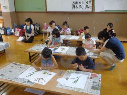 子どもたちは,神野先生から植物採集の仕方をまず教わり,その後実際に標本作りをしました。エノコログサを画用紙の上に形を整えて置き,小さく切った白紙でのり止めしながら作っていきました。画用紙の右下には,科名や和名を書いたラベルもはりました。