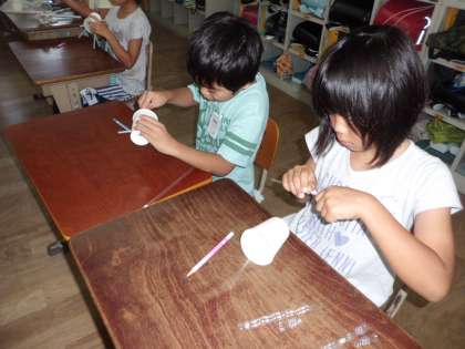 ストローと紙コップを使って,動くおもちゃの仕組みを作りました。