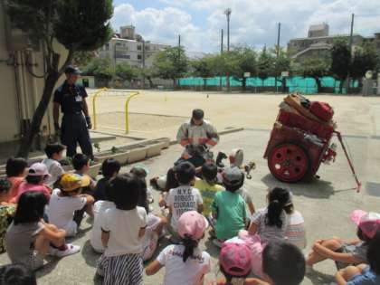 消防車に乗せてもらうグループは,運転席と助手席にわかれて乗せてもらいました。予想以上に座席が高く,またいろいろな機械がついていて驚きながらもとても喜んでいました。 よい経験になりました。