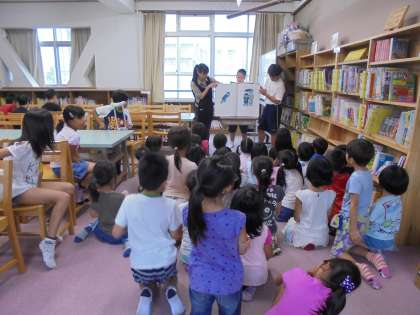 9月6日(火)より,蜂ヶ岡中学校の生徒さんが生き方探究チャレンジ体験として本校に来てくれています。今日は,中間休みに図書室で本の読聞かせをしてくれました。読んでくれた本の題名は,「おじさんのかさ」。子どもたちは興味津々に,お話を聞いていました。