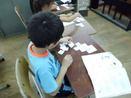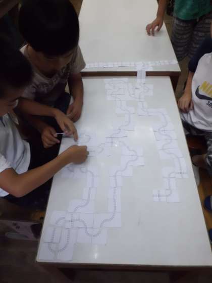 休み時間には,友だちとカードを合わせて,大きな線路づくりにも挑戦していました。