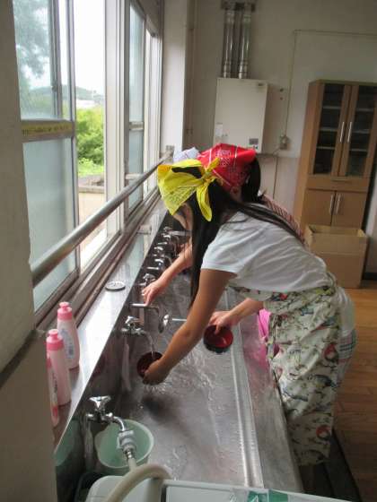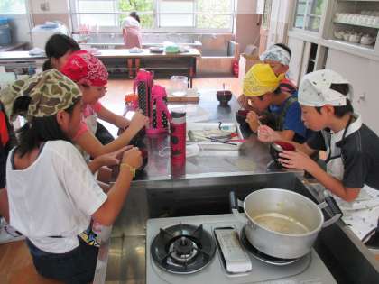 花背山の家の宿泊学習に向けて,調理の練習を行いました。山の家では,カレーと焼そばを作ります。ジャガイモ・ニンジン・キャベツなど,山の家でも使う材料を使って,今日は野菜スープを作りました。包丁の使い方や硬いものからゆでることなど基本的なことを習ってからスタートしました。なかなか慣れないことで,手際良くとはいきませんでしたが,グループで協力しながら楽しく作ることができました。スープも美味しく完成し,後片付けまでしっかりできました。