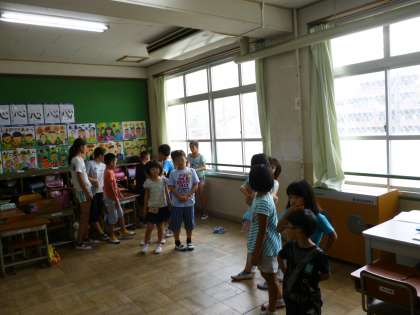 3年3組の教室では、縦割りグループで「伝言ゲーム」をしました。低学年から高学年までが集まり、順にコソコソとお話している様は可愛らしいです。