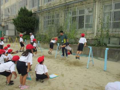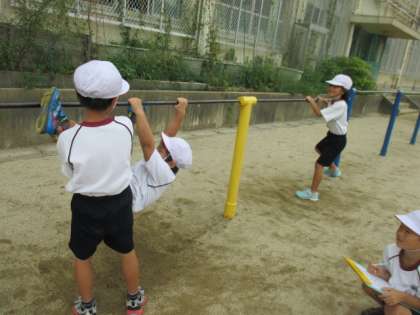 運動場での体育の学習は,「てつぼうあそび」をしています。