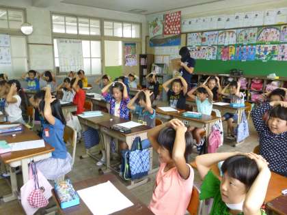 「キーワードゲーム」をしています。キーワードとなる単語を決めておきます。その単語が出てきたら、二人の間に置いている消しゴムを取ることができます。素早く消しゴムをゲットした者が勝ちというハラハラドキドキの楽しいゲームです。良く聞いておかないとお手付きをしてしまいますよ。