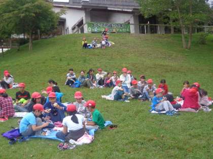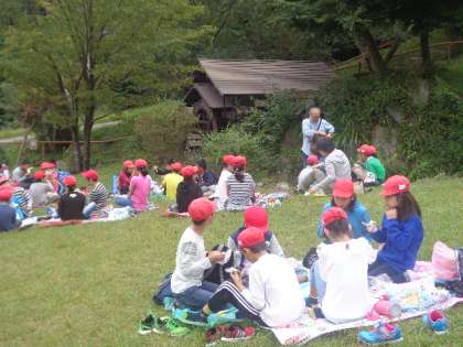 お昼ご飯は、水車小屋の前の芝生で班ごとにお弁当を食べました。子どもたちはおいしそうに食べていました。