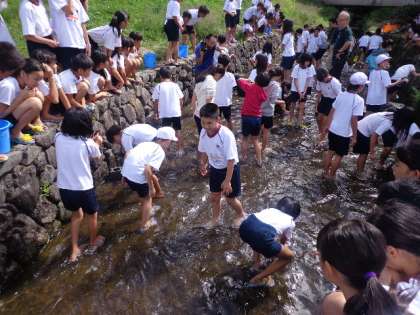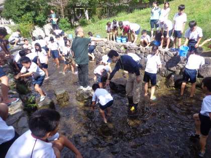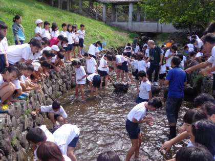 魚つかみに挑戦しました。すぐに上手にとる子もいれば、とったけれどすぐに逃げられてしまう子、なかなかとれない子など様々でしたが、最後はみんな自分でつかんでバケツに入れられました。この後は魚をさばきます。