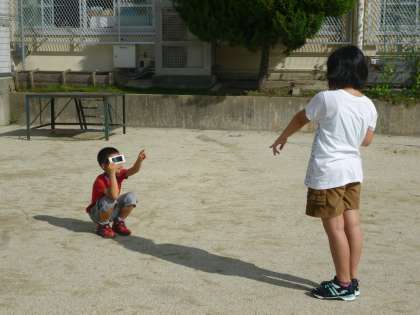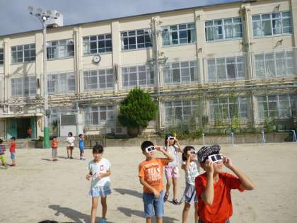 今日は、朝から良いお天気になりました。運動場に、くっきりと「かげ」ができました。理科でかげと太陽の関係を調べています。初めて遮光板も使いました。太陽はオレンジ色でまんまるだったよ。