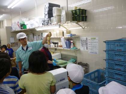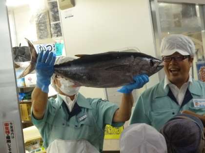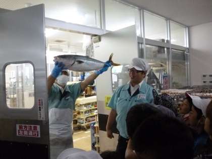 バックヤードの見学をしています。大きな魚をこれから解体するようです。これは、「ぶり」です。その下は「まぐろ」です。れんこんもきれいに洗ってカットしていましたよ。みんな「おー!」と歓声をあげていましたね。