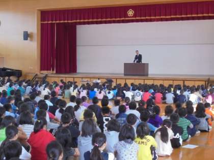 始業式では,校長先生から,子どもたちにも人気のアニメの登場人物が紹介され,その人物のように「やさしい心と思いやりをもった人になりましょう。」というお話がありました。