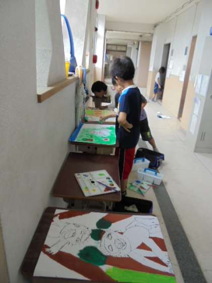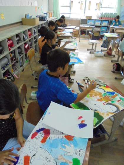 下書きが終わったら,ポンポンやローラーを使って背景を描いている人や,自分の指を使って登場人物の毛並みを表現している人もいます。