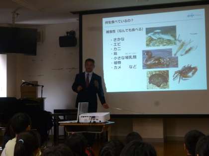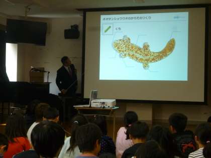 今日は、京都水族館から博士をお呼びして出前授業をしていただきました。何の博士かというと「オオサンショウウオ」です。このオオサンショウウオの生態系を知ることで、私たちの環境問題について考えていこうというわけです。