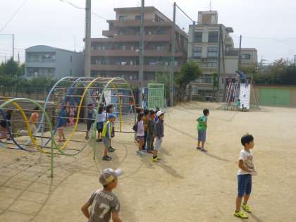 今日も良いお天気でしたね。中間休みはクラスのみんなで「けいどろ」をしました。鬼に捕まった子は、らくだこぶに集合して仲間の助けを待っています。もうすぐ11月だけど、まだまだ暑いね。