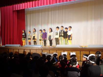 午前中後半の部の初めは,合唱部の合唱です。美しいハーモニーを会場全体に響かせてくれました。続いてひまわり学級の劇『サラダで元気』でした。