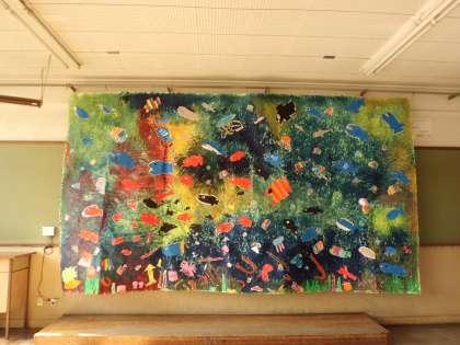 今日は,学芸会の余韻に浸りながら,場面ごとに記念写真を撮りました。みんな,背景の絵をとても気に入っています。一人一人,海の生き物を描きました。93人分の生き物が泳ぎだすと寂しい海の中が,一気に楽しく輝いた世界となりました。しばらく2年生の学習室に飾っておきたいと思います。