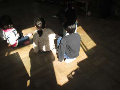 給食当番を終えて教室に帰ってくると,床に座り込んでいる子たち。